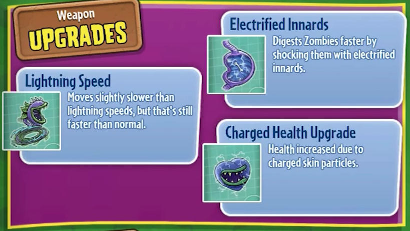 With the exception of Chomp Thing all of these chomper variants have the same 3 upgrades despite these upgrades having different names, the upgrades effects are: